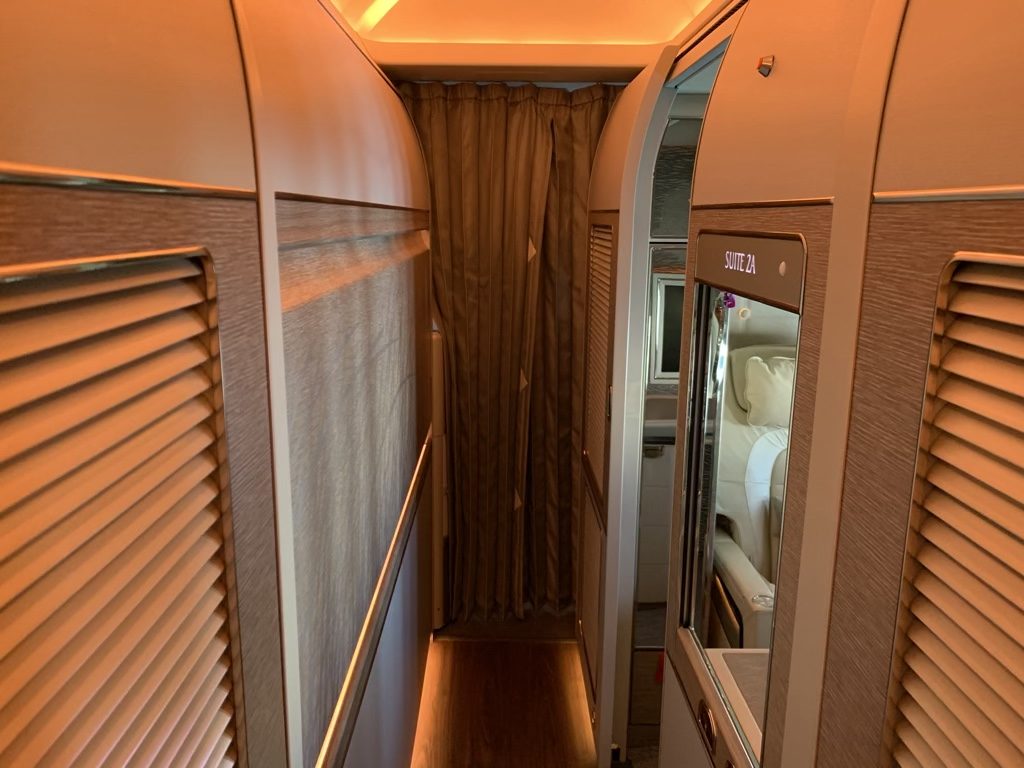 Etwas womit ich allerdings noch nicht 100% warm geworden bin, sind die komplett verschlossenen Suiten. Diese sind zwar mit über drei Quadratmetern im Flugzeugstandard riesig, wenn man allerdings bei geschlossener Tür in der Suite sitzt, fühlt es sich genau so an, wie es ist. Man sitzt in einem drei Quadratmeter großen geschlossenen Raum. Platzangst sollte man hier wirklich nicht haben.