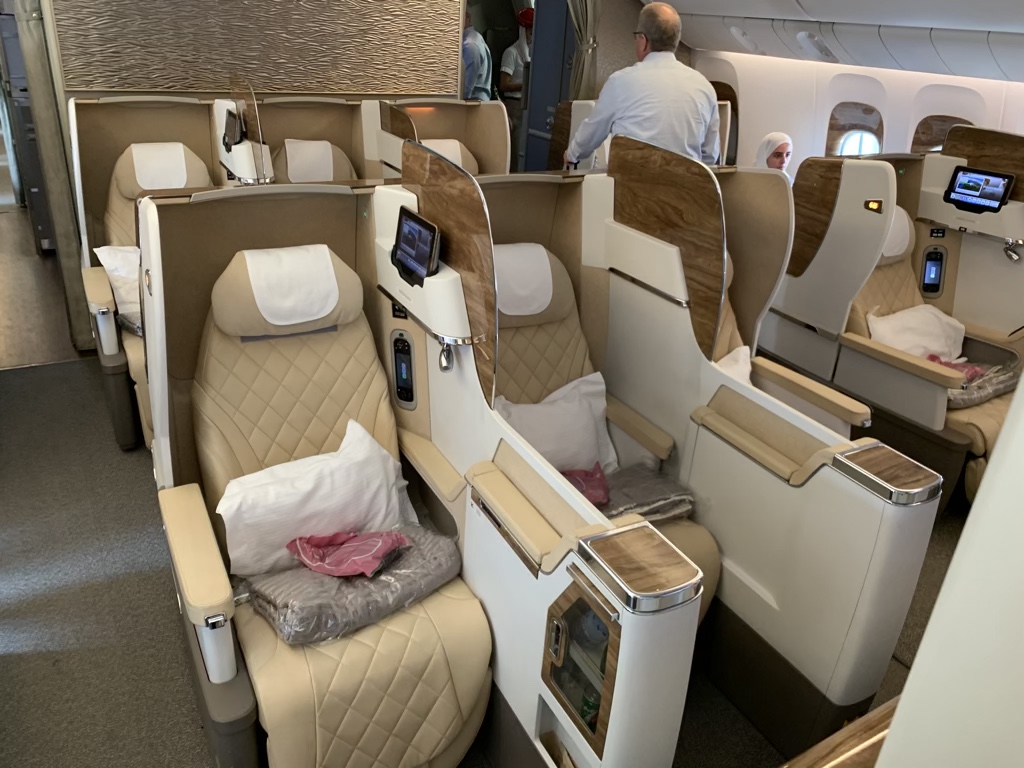 Direkt hinter meinem Sitz begann die „neue Emirates Business Class“ in der Boeing 777-300er. Diese verfügt immer noch über eine 2-3-2 Anordnung, was bei einem 2019 ausgelieferten Flugzeug eigentlich eine Schande ist, auch wenn die Kabine selbst wunderschön aussieht.