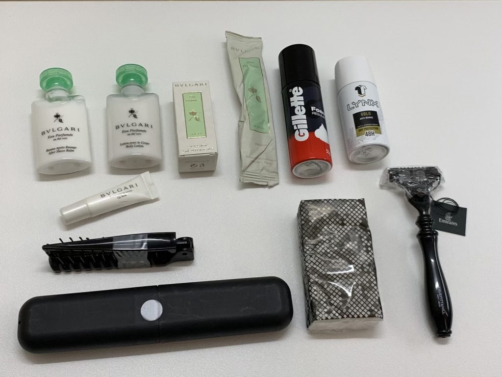 Emirates bietet in der First Class eines der umfangreichsten Amenity Kits, welche ich kenne. Mit allerlei Cremes, Deo, Rasierer und richtigem Rasierschaum, sowie einer Zahnbürste und einer Haarbürste hat man hier wirklich alles, was man braucht.