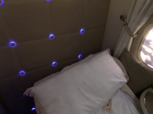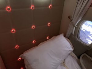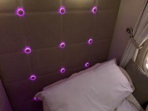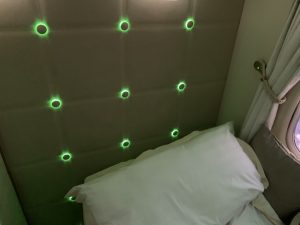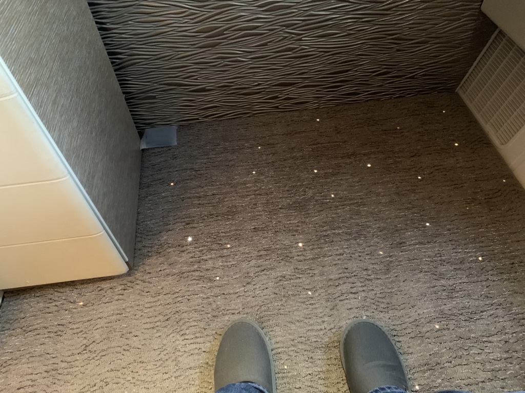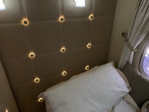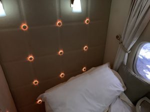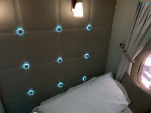 Neben der Lichtorgel in der neuen Suite ist Emirates auch für den Sternenhimmel in der Kabine berühmt. Diesen hat man natürlich auch in der neusten Boeing 777-300er installiert, allerdings kommt er hier in der Suite nicht zur Geltung, weshalb man in den Boden kleine Sternenlichter eingelassen hat. Die Flugbegleiter sagte hierzu, man schlafe jetzt nicht unter, sonder gleich über den Sternen.