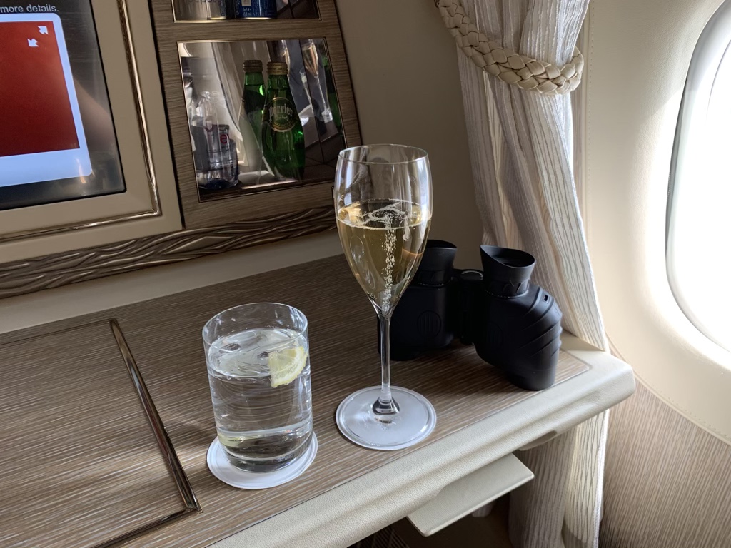 Nachdem ich mich in meinem Sitz eingerichtet hatte, stellten sich beide First Class Flugbegleiterinnen bei mir vor und fragten mich direkt nach meinen Getränkewünschen. Meine „First Class Standardbestellung“ aus einem Wasser und einem Glas Champagner wurde auch direkt geliefert, allerdings hatte ich vergessen, dass bei Emirates am Boden in Frankfurt nur den Business Class Champagner und nicht der Dom Perignon serviert wird, da Emirates die Steuern (inkl. Deutscher Sekt Steuer zum Erhalt der kaiserlichen Flotte) nicht für den teuren Champagner bezahlen möchte.