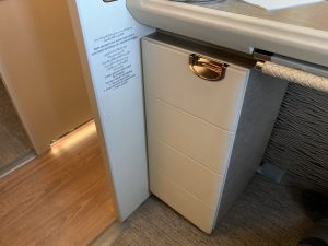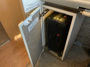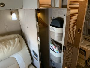 Nachdem es in der ganzen Kabine natürlich keine Overheadbins mehr gab, musste man das Handgepäck in der Suite selbst verstauen. Unter dem Tisch gab es einen Schrank für einen Handgepäckskoffer, allerdings sollte dieser wirklich nur die normalen IATA Maße haben, denn mein Koffer passte gerade so hinein.