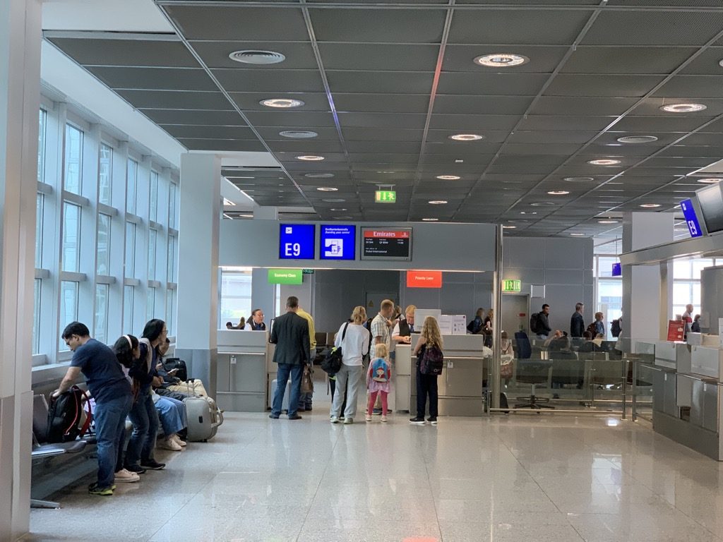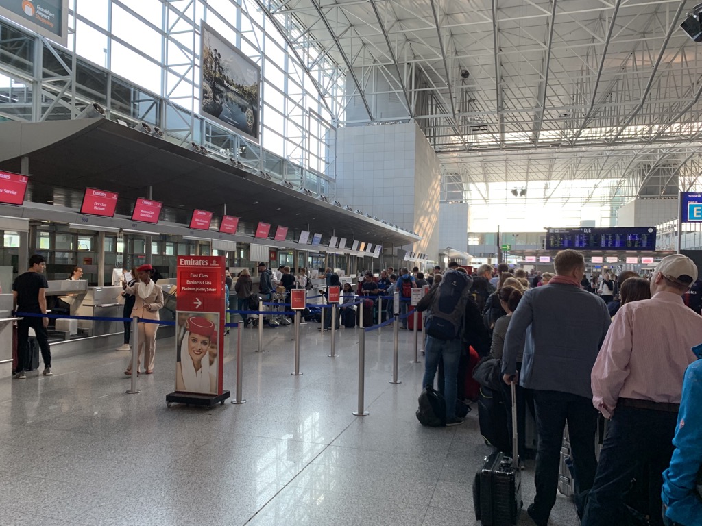 Ich bin stattdessen ganz stillos mit dem Zug zum Frankfurter Flughafen gefahren und habe am Check-In Schalter nur noch meine Bordkarte abholen wollen. Vor den Emirates Check-In Schaltern hatte sich eine riesige Schlange gebildet, allerdings waren die separaten First- und Business Class Schalter verwaist, sodass man hier auch die Economy Class abgefertigt hat.