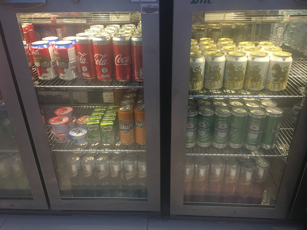 In dem dunkleren Raum befinden sich Kühlschränke mit den Getränken (Softdrinks, Säfte, Kakao und Bier). Zudem gibt es eine Self-Service Cocktail/Longdrink Bar mit einer reichhaltigen Auswahl.