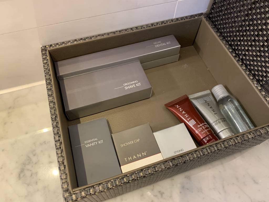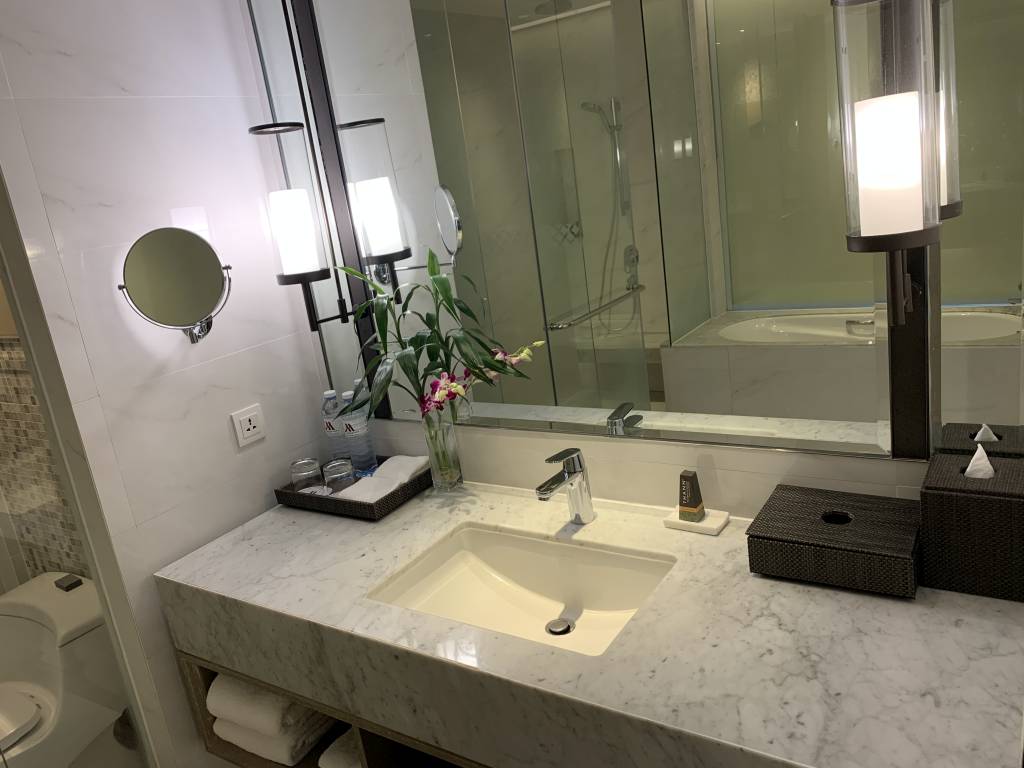 Das Bad war in diesem Fall nicht voll verglast, ließ aber durch ein großes Fenster den Blick und den Raum und auch nach draußen werfen. So konnte man während eines Bades in der großen Badewanne die Aussicht auf das Meer genießen. Für mehr Privatsphäre ließ sich die Scheibe durch ein Rollo verdunkeln. Hinter der Badewanne befand sich die Dusche, welche durch eine Glasscheibe von der Toilette abgetrennt war. Der Marmor-Waschtisch mit Pflegeprodukten von Thann komplettierte das Bad. Etwas verwundert hat mich, dass die Toilette hier keinerlei Bidet-Alternative hatte. Eine klassische westliche Toilette ohne Wasserschlauch war mir in Thailand in einem Hotel neu. Dachte ich zumindest.