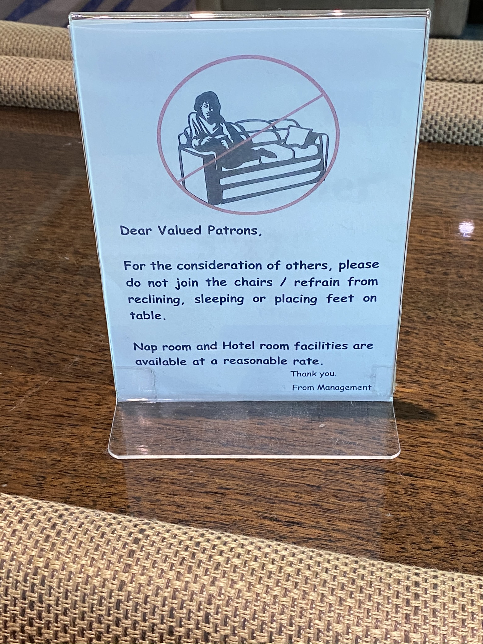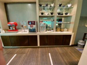 Man merkt an allen Ecken und Enden, dass die Lounge „for profit“ betrieben wird und es dabei nur einen Gewinner geben kann. Wer auf dem Weg zum Abfluggate noch eine Gratis-Cola und einen Apfel abgreifen möchte findet dieses in dieser Lounge. Wer vor einem Flug mit Scoot o.ä. noch einmal fürstlich schlemmen und ausgedehnt in einer schicken Lounge abhängen möchte eher nicht.