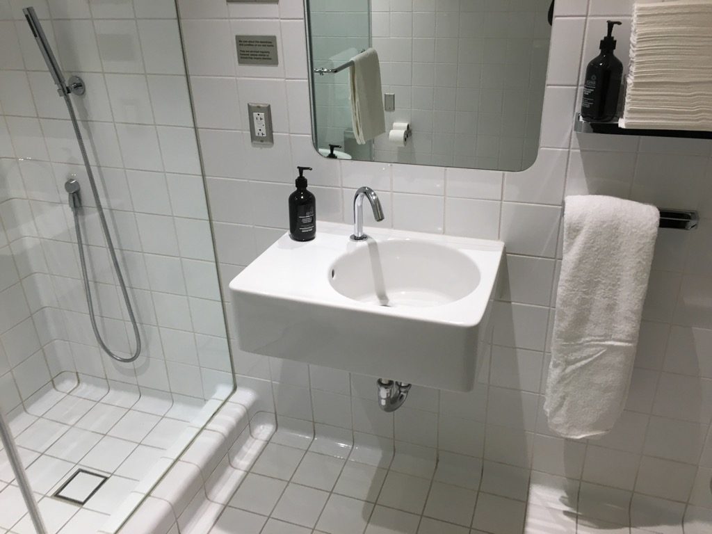 Die Qantas First Class Longe in Los Angeles verfügt auch über eigene Duschen und Toiletten. Die Duschen selbst sind angenehm groß, sauber und gut belüftet. Allerdings bin ich kein Fan der Duschamenities in den großen Spendern. Ich bevorzuge in einer First Class Lounge doch kleine Flaschen, wie in einem Hotel. Ansonsten kann man natürlich alles, vom Fön über die Zahnbürste, bis zum Rasierer in den Duschräumen nutzen.