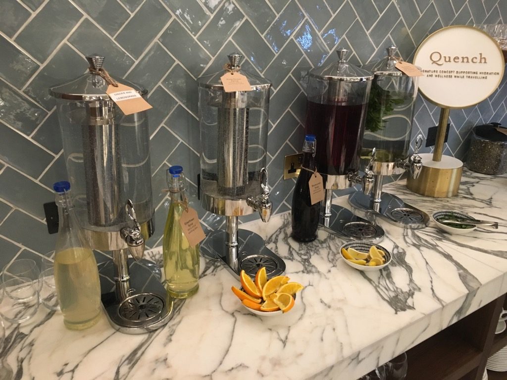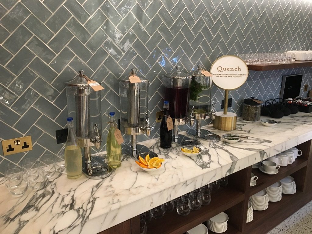 Neben dem Buffet gibt es noch eine Kaffee-, Tee- und Limonaden Theke. Darunter befinden sich Kühlschränke für Softdrinks. Alkoholische Getränke gibt es an den beiden Bars in der Qantas Lounge.