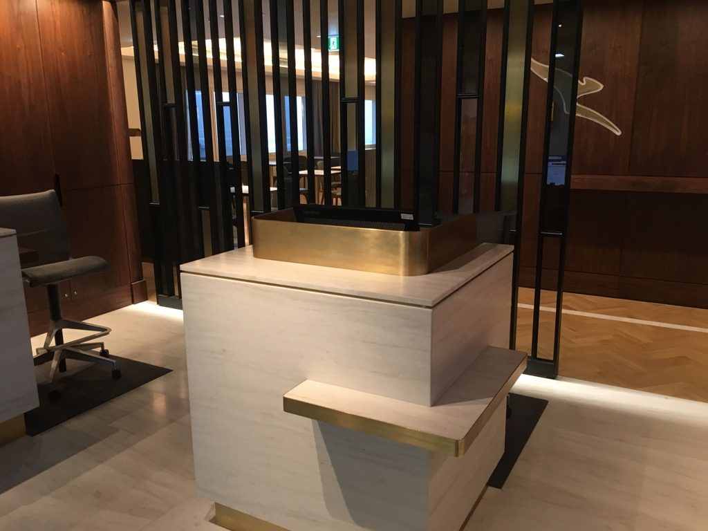 Die Qantas Lounge London Heathrow ist extrem einfach zu finden. Direkt nach der Pass- und Sicherheitskontrolle in Terminal 3 läuft man auch schon auf die Qantas Lounge zu. Hier sieht man auch die direkt das Qantas Logo in der Holzwand, sowie den Front Desk durch die Glastür.