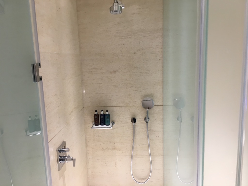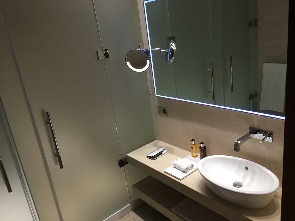 Wie es sich für eine Arrivals Lounge gehört, gibt es in der Lounge natürlich auch einige Duschen. Diese sind kleine Badezimmer und haben eine sehr angenehme Größe. So hat jede Dusche einen eigenen kleinen Vorraum, in welchem eine Bank für den Koffer und ein Sessel steht. Weiter hinten ist die Regenwalddusche mit einem Wachbecken und einer separaten Toilette.