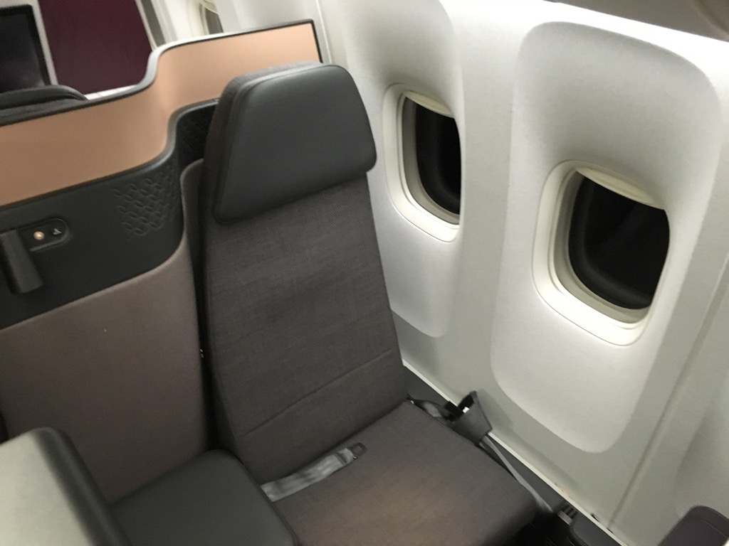 Die Sitze selbst sind sehr großzügig dimensioniert. Der Sitz selbst ist schon verhältnismäßig breit, allerdings wirkt die ganze QSuite extrem geräumig. Durch den keinen Nebensitz direkt neben dem eigentlichen Sitz und auch wegen der riesigen Ablagefläche an der Seite, welche über dem Fußfach des Nachbarn ist.
