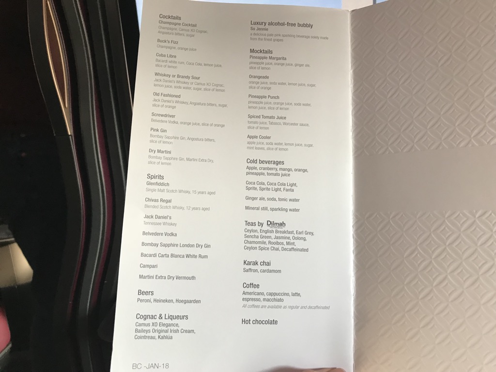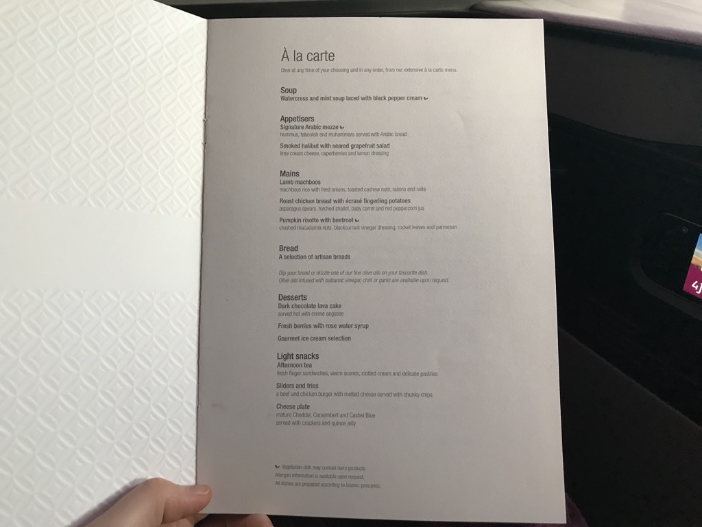 Theoretisch hätte es noch eine Vielzahl an Snacks gegeben, welche man sich hätte bestellen können, allerdings ist die Flugzeit von sechs Stunden nach Doha einfach zu kurz um sich hier durch dieses extrem umfangreiche Menü zu essen.