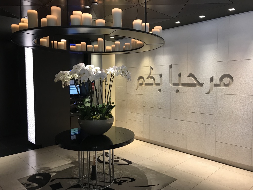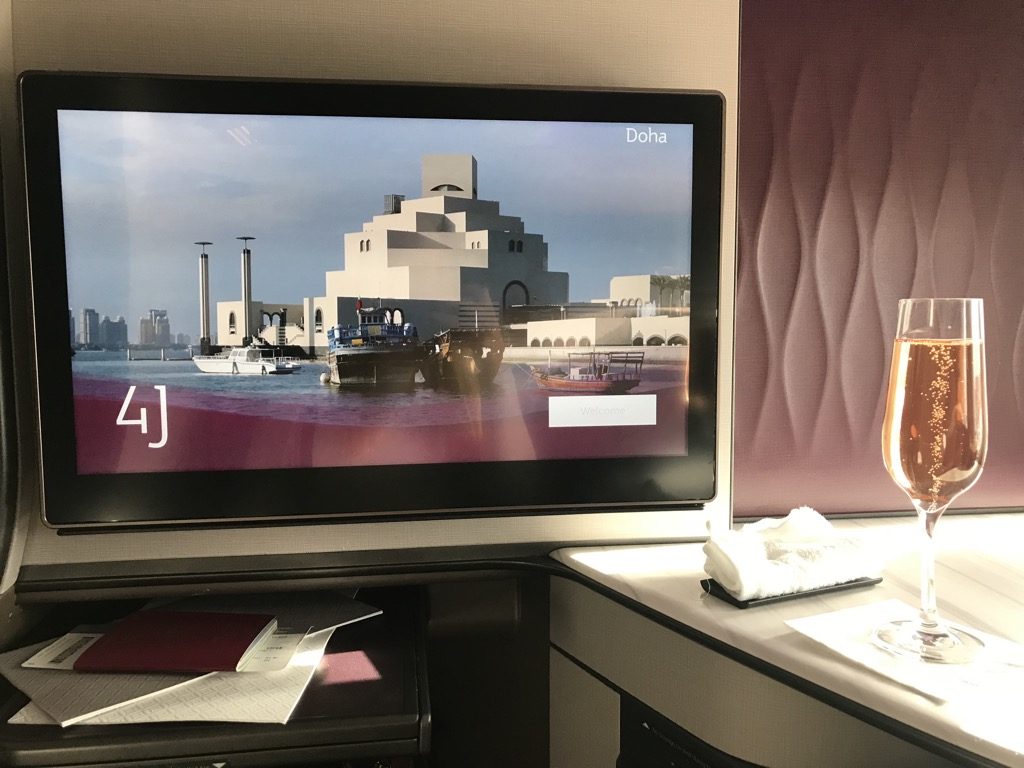 Wir haben in der Qatar Airways Premium Lounge bei einem kleinen Lunch und einem Glas Champagner auf unseren Abflug gewartet. Als das Boarding für unseren Flug, QR08 begonnen hatte, wurden die Gäste vom Loungepersonal über das laufende Boarding informiert, sodass man in aller Ruhe zu dem nahegelegenen Gate 5 laufen konnte.