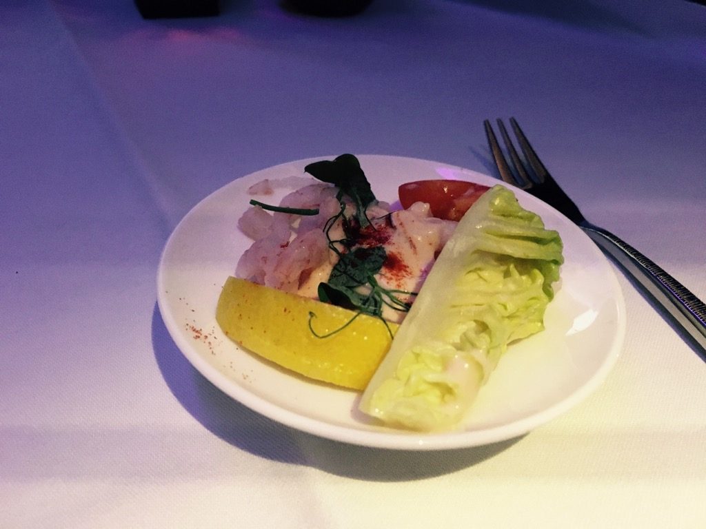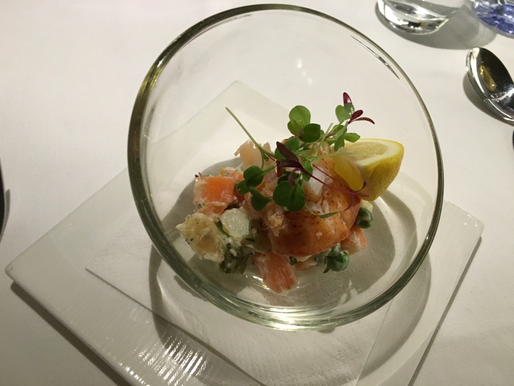 Direkt zum eingedeckten Tisch, gab es auch noch einen kleinen Gruß aus der Küche. Der Krabbencktail war sehr gut und leider das Highlight des Essens.