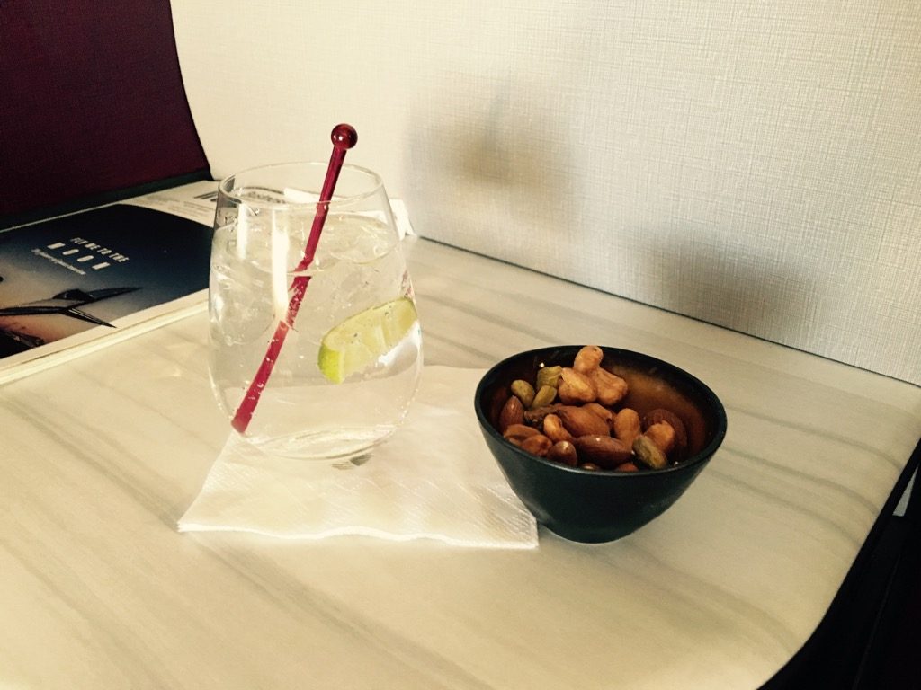Kurz nachdem die Anschnallzeichen ausgegangen sind, wurde mir von meiner Flugbegleiterin bereits mein Gin&Tonic, samt warmer Nüsse serviert. Das Wasser, welches ich dazu bestellt habe, wurde leider vergessen, allerdings gab es kurz darauf zum Essen auch ein Glas Wasser, weshalb es alles andere als schlimm war.