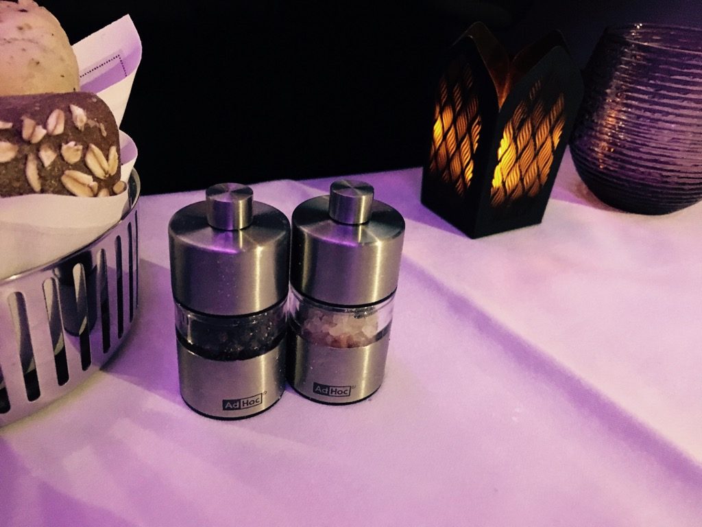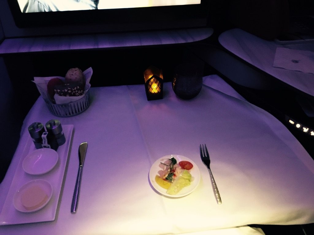 Nachdem ich meinen Gin&Tonic getrunken hatte, wurde mein Tisch eingedeckt. In der Qatar Airways QSuite, bekommt man wie oben schon erwähnt etwas anderes Geschirr und auch eine kleine Lampe, mit einem elektrischen Teelicht. Nachdem bereits die Sonne draußen untergegangen war, hatte ich so mein eigenes, kleines Candlelight Dinner.