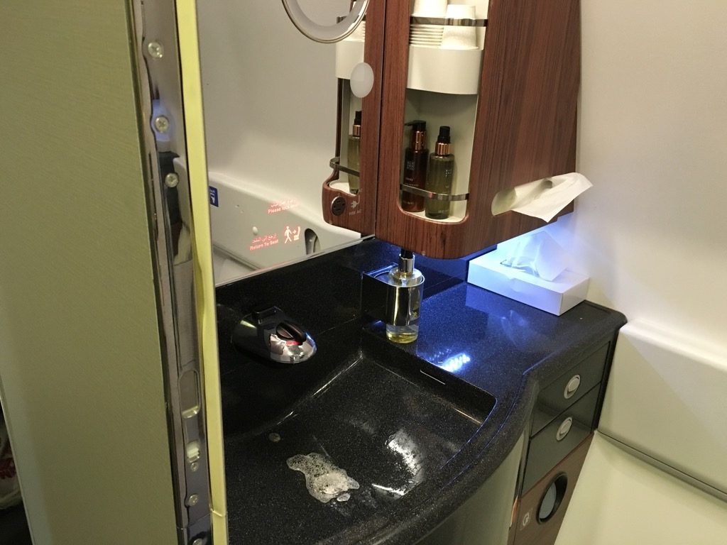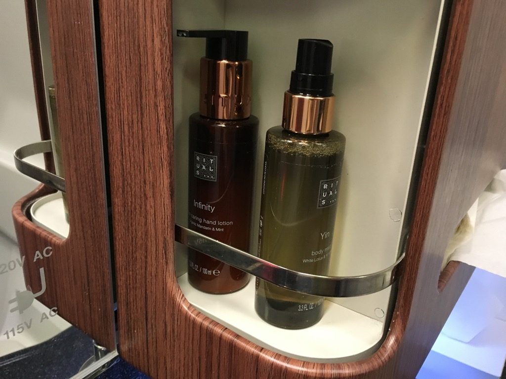 Positiv sind natürlich die Amenitys von Rituals in den Toiletten der Business Class. Auch dass es für 40 QSuites gleich vier Toiletten gibt, ist überdurchschnittlich. So musste ich zu keinem Zeitpunkt warten, dass ein Waschraum frei wird.