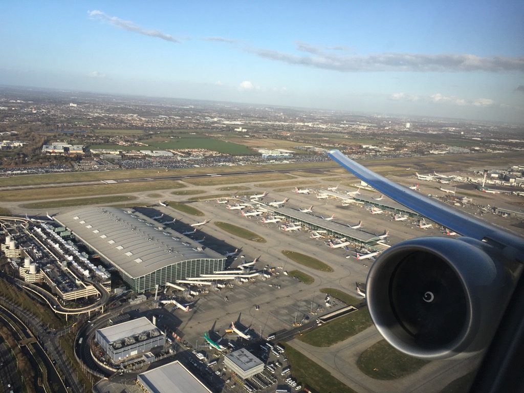 Nachdem das Boarding doch recht lange dauerte, wurden die Gläser auch noch einmal aufgefüllt, bevor die Türen geschlossen wurden und wir zur Startbahn rollten. Durch die teilweise rückwärts zur Flugrichtung angebrachten Sitze, welche ich gleich noch einmal ausführlicher beschreiben werde, hatte man eine fantastischen Blick auf den Flügel und den Flughafen von Heathrow beim Start.
