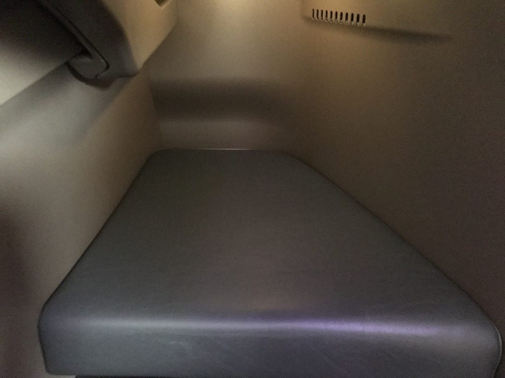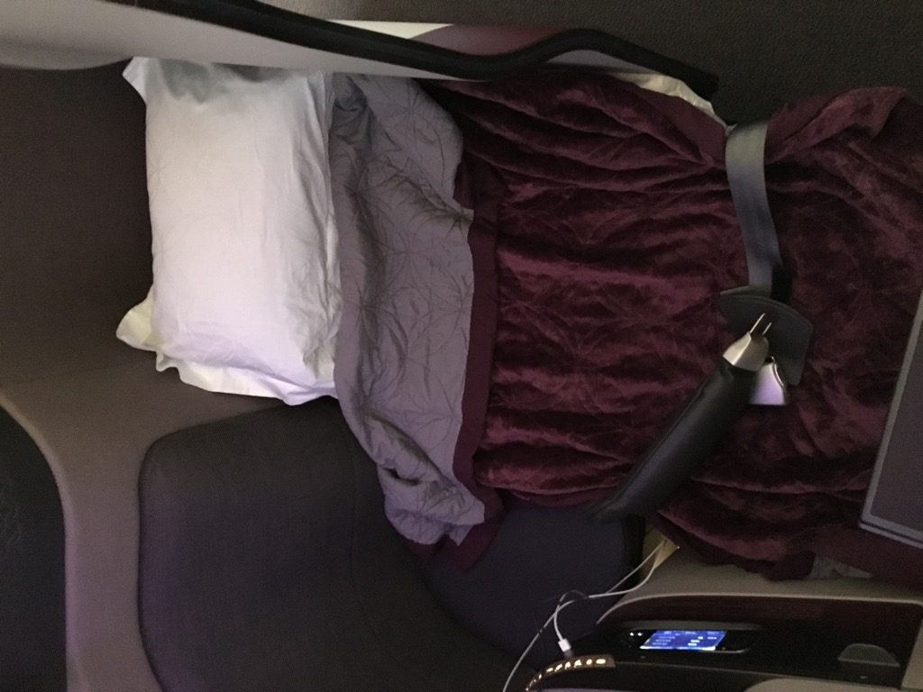 Wenn man schlafen möchte, kann man sich von der Crew das Bett machen lassen. Hierfür wird eine Matratze auf den Sitz aufgelegt und die kuschlige Decke drapiert. Dass Nicole fast 20 Minuten warten musste, bis die Crew so weit war, dass sie ihr das Bett gemacht hat, ist allerdings ein kleiner Schönheitsfehler. Ich selbst habe daher für mein etwa ein stündiges Schläfchen auf den Turn down Service verzichtet.
