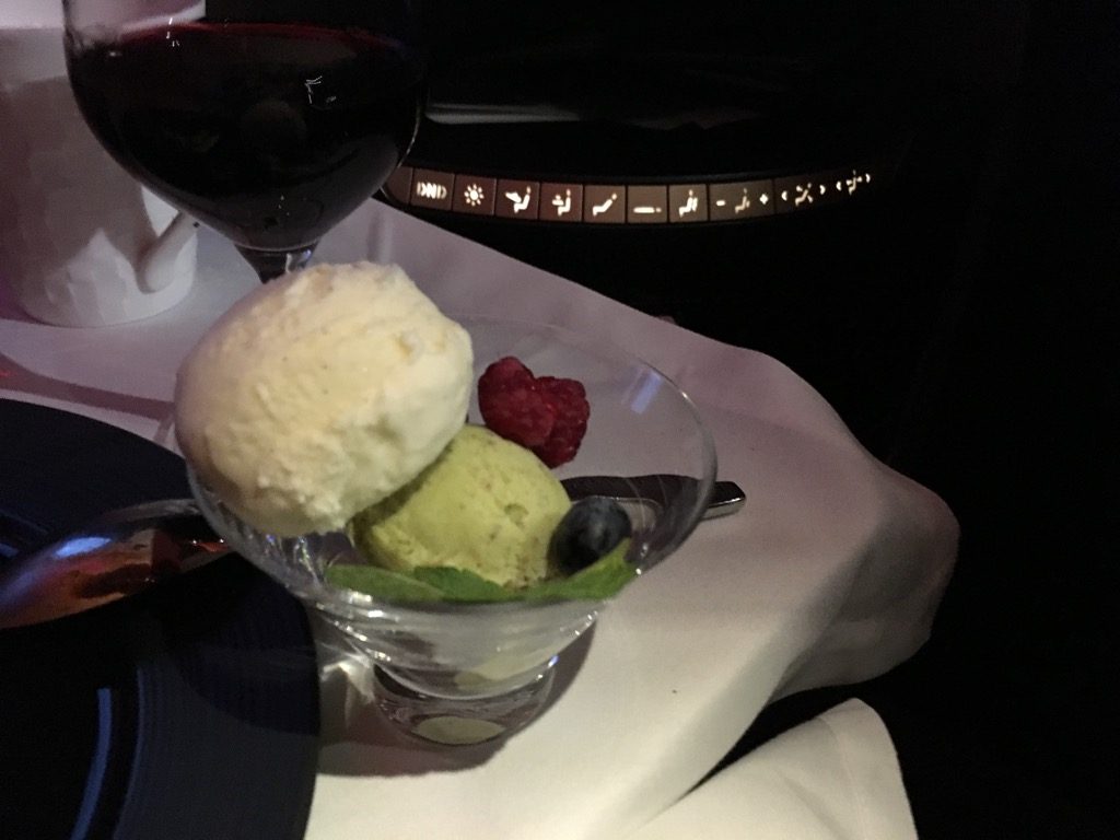 Als Hauptgang hatte ich die Hühnerbrust mit Pfeffersause gewählt. Das Hünchen war leider etwas trocken, dafür war die Pfeffersoße gut abgeschmeckt, was im Flugzeug immer sehr wichtig ist. Ein Stück Fleisch im Flugzeug saftig zu erwärmen ist allerdings auch nicht ganz einfach und bedarf auch eines extrem guten Caterers. Daher sollte man die Kritik am Essen nicht zu dramatisch sehen.
