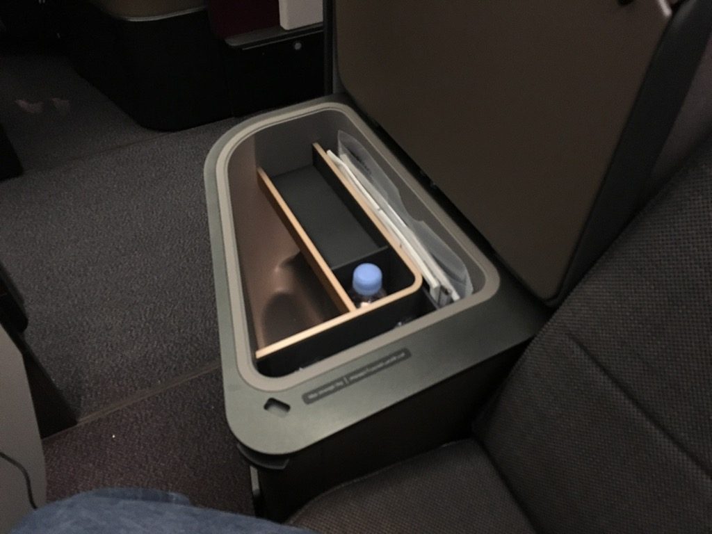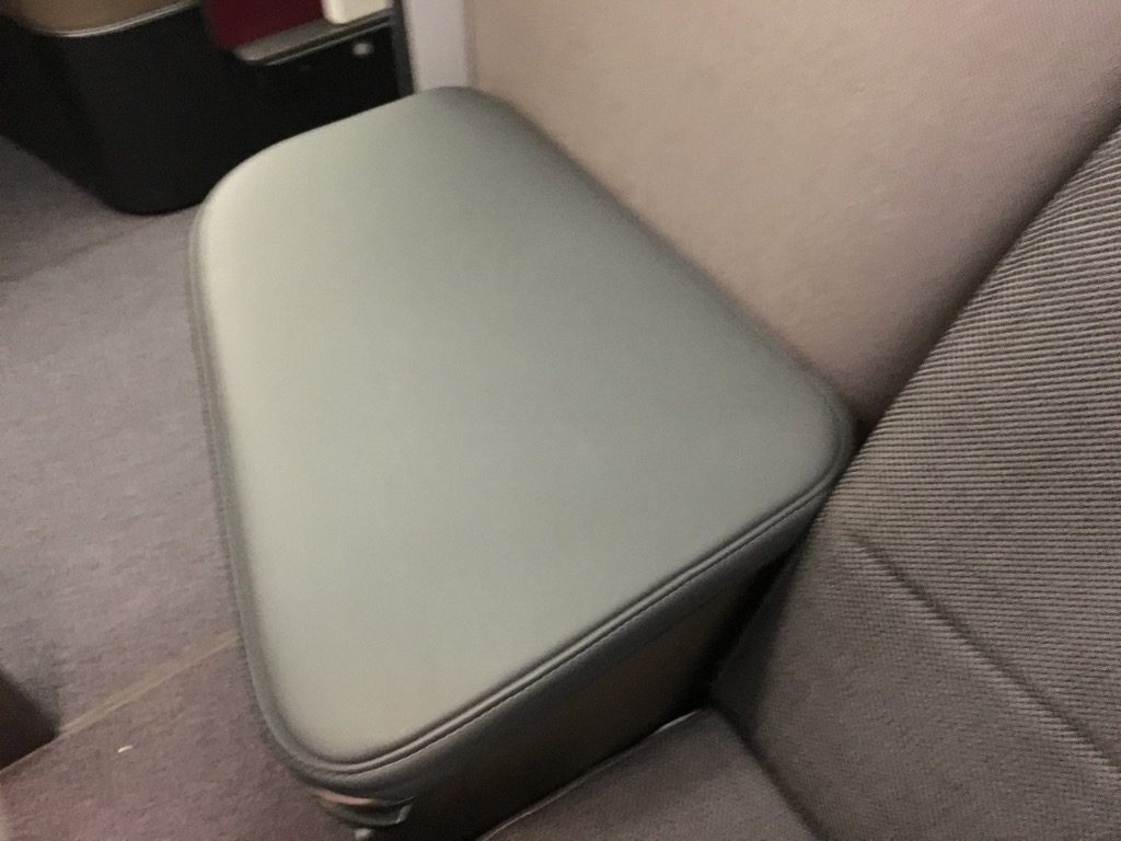 Der große Tisch ist über dem Fußfach angebracht. Hier ist er sehr leicht zugänglich und der Tisch selbst ist auch sehr stabil, sodass er weder beim Essen, noch beim Arbeiten schwankt oder wackelt, was bei manchen Business Class Sitzen ein Problem ist. Ich finde zwar die offene Position im Fußfach nicht ideal, allerdings fällt mir hier auch keine bessere Lösung ein. Vielleicht einfach ein kleiner Schönheitsfehler.