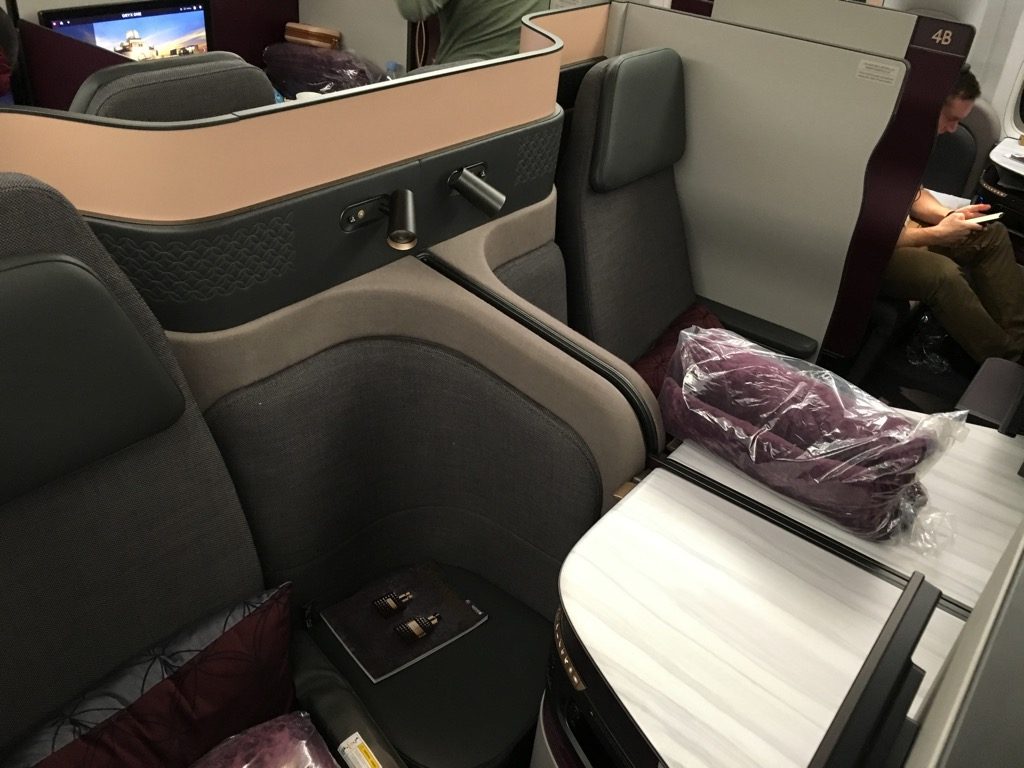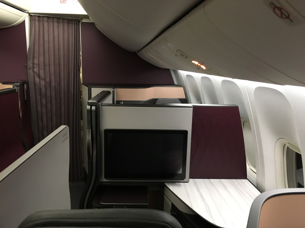 Wir hatten, wie bereits erwähnt je eine QSuite am Fenster auf der rechten Seite. Diese Sitze sind sehr privat und eher für Alleinreisende zu empfehlen. Ich finde es schade, dass man hier die Option mit dem verschiebbaren Fernseher nicht auch installiert hat. Aber sechs Stunden bis Doha, schafft man auch mal ohne direkt neben seinem Ehepartner zu sitzen.