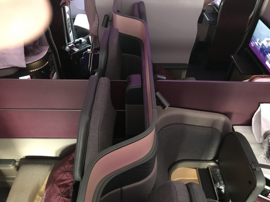In der Mitte gibt es je versetzt zwei Doppelsitze, welche nahe beisammen liegen und damit für Paare gut geeignet sind. Diese ähnelt den Honeymoon Sitzen, welche wir letztes Jahr im Thai Airbus A350 von Rom nach Bangkok geflogen sind. Bei der Qatar Airways QSuite, sind diese Honeymoon Sitze entgegen der Flugrichtung angeordnet.