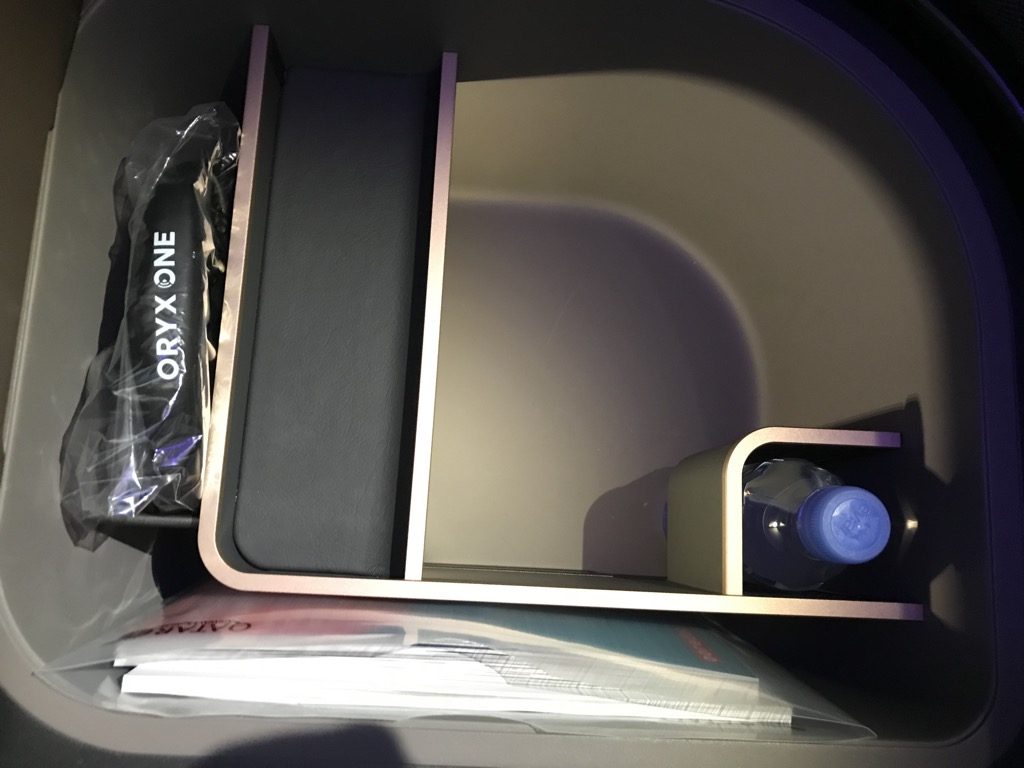 Nebenbei befindet sich noch ein riesiges Staufach in dem Ottomanen. Hier kann man eigene Sachen verstauen und findet auch das Magazin, die Kopfhörer und eine Wasserflasche darin. Da fast alles im Ottomanen verschwindet, wirkt die QSuite auch sehr aufgeräumt.