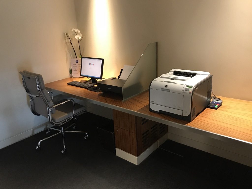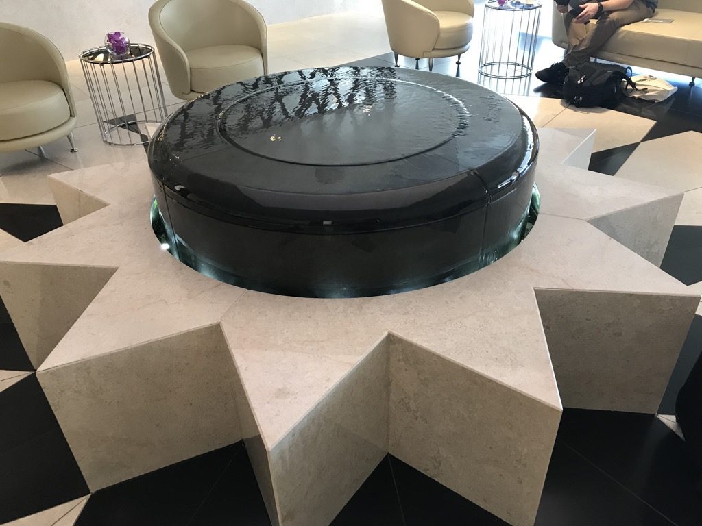 Nach dem Betreten der eigentlichen Lounge schauten wir direkt auf eine Sessellandschaft, mit einem schönen Brunnen in der Mitte. Links von den Sesseln befand sich ein kleines Business Center mit Computern und einem Drucker.