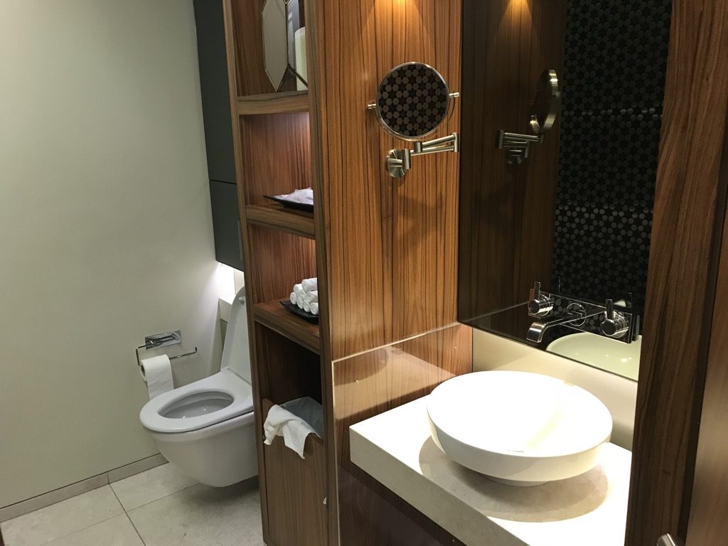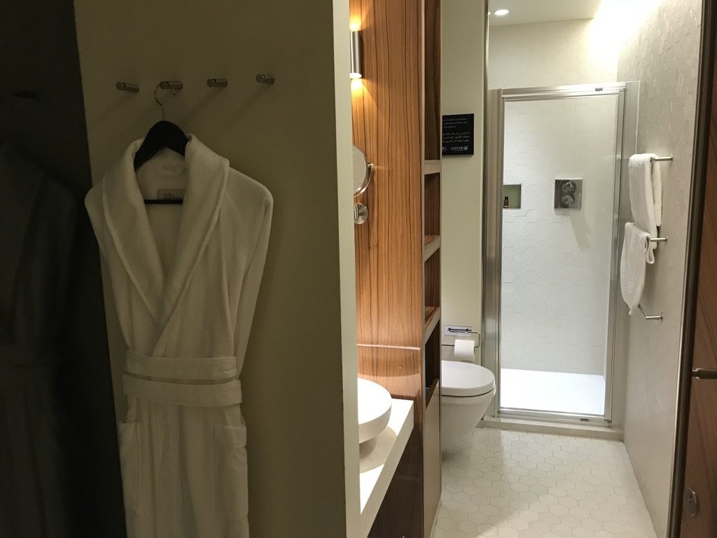 Neben dem Business Center war der Eingang zu den sanitären Einrichtungen. Die Qatar Airways Premium Lounge verfügte über sehr saubere Toiletten und Duschen, die mit allerlei Amenities ausgestattet waren. Vor einem Langstreckenflug, bzw. nach so viel Umbuchungsstress ist eine Dusche nie verkehrt ;).