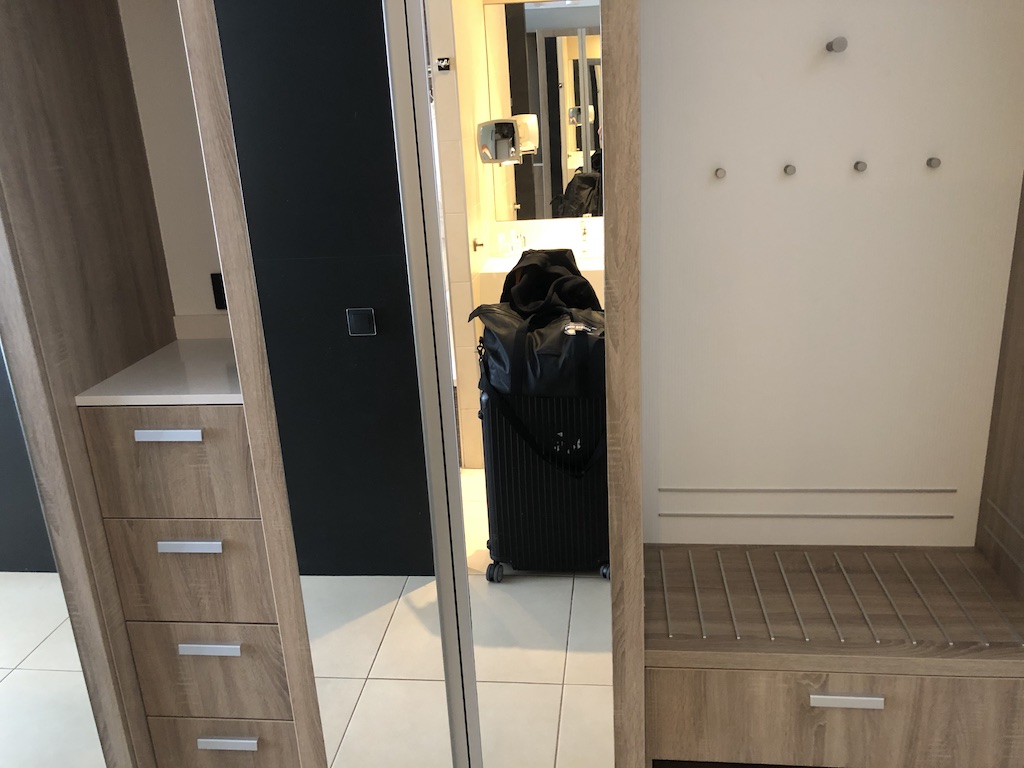 Die Einrichtung ist modern und hell, die Möbel erscheint neuwertig. Die Größe der Zimmer ist mit 35m² etwas üppiger und absolut ausreichend für zwei Personen. An dem Schrank ist zwar eine Kofferablage, diese ist jedoch relativ klein geraten und liegt ungünstig hinter der Eingangstür.