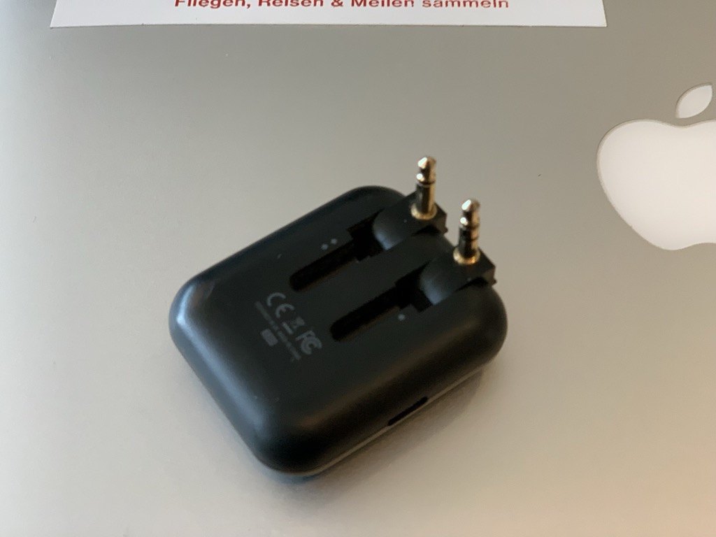 Nachdem mir dies äußerst unsinnig vorkam, habe ich mich auf die Suche nach einer Lösung gemacht und mit dem RHA Wireless Flight Adapter einen kleinen günstigen Adapter gefunden, mit welchem ich im Flugzeug meine kabellosen Kopfhörer wie gewohnt weiter verwenden kann.