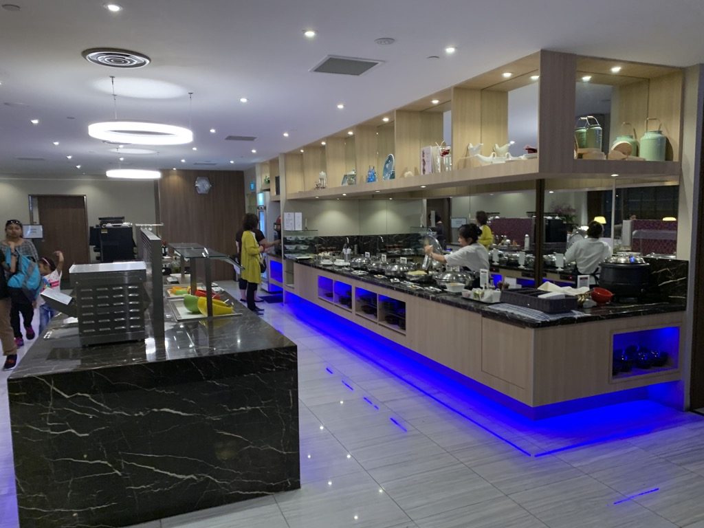 Der Restaurantbereich der SATS Premier Lounge Singapur bestand im Wesentlichen aus einem großen Buffet und eingingen Hochtischen mit Stühlen, an denen man Essen konnte.