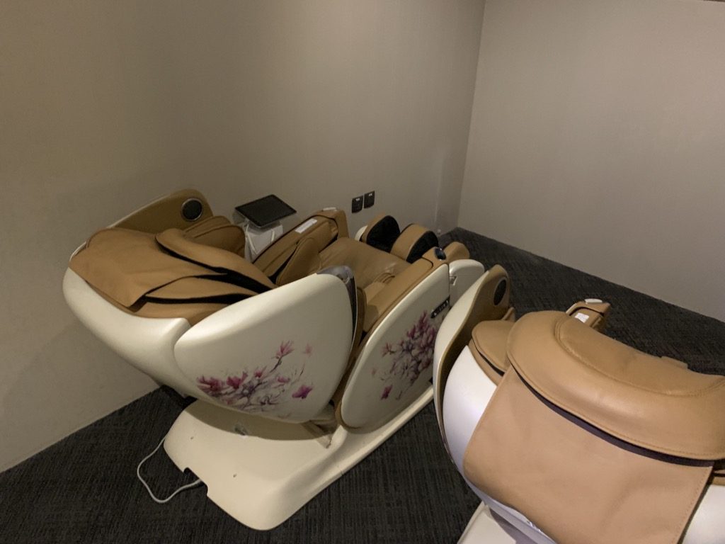 An den Wänden der Lounge befanden sich durch Raumtrenner abgetrennte Bereiche, welche teilweise Arbeitsplätze darstellten und auch noch Ruhebereiche mit Massagesesseln.