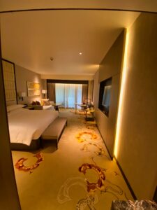 Auf dem Zimmer angekommen erwartete mich ein großer modern eingerichteter Raum mit Blick auf den Pool. Da zuckte ich ein erstes Mal: wenn es bald wärmer werden würde, dann ging bestimmt der Betrieb am Pool los und ich wollte doch endlich schlafen. Aber dazu später mehr.