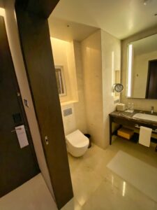 Ich hatte – gänzlich ungewohnt – eine Rate mit Hoteltransfer gebucht. Das sollte eher der Bequemlichkeit und der Generierung von Punkten als allem anderen dienen. Jedenfalls wurde ich von einem sehr freundlichen und gut aufgelegten Chauffeur am vereinbarten Treffpunkt in Empfang genommen und zum Fahrzeug begleitet. Sobald ich das Terminal verließ musste ich schmunzeln. Das Hotel liegt ca. 200m Luftlinie davon entfernt. Aber: die Fahrt dauerte trotzdem fast zehn Minuten, da es erst durch verschiedene Checkpoints und dann auf einem sehr indirekten Weg zum Hotel ging. Die Straßenführung gibt es nicht anders her.