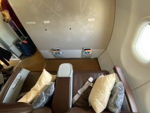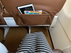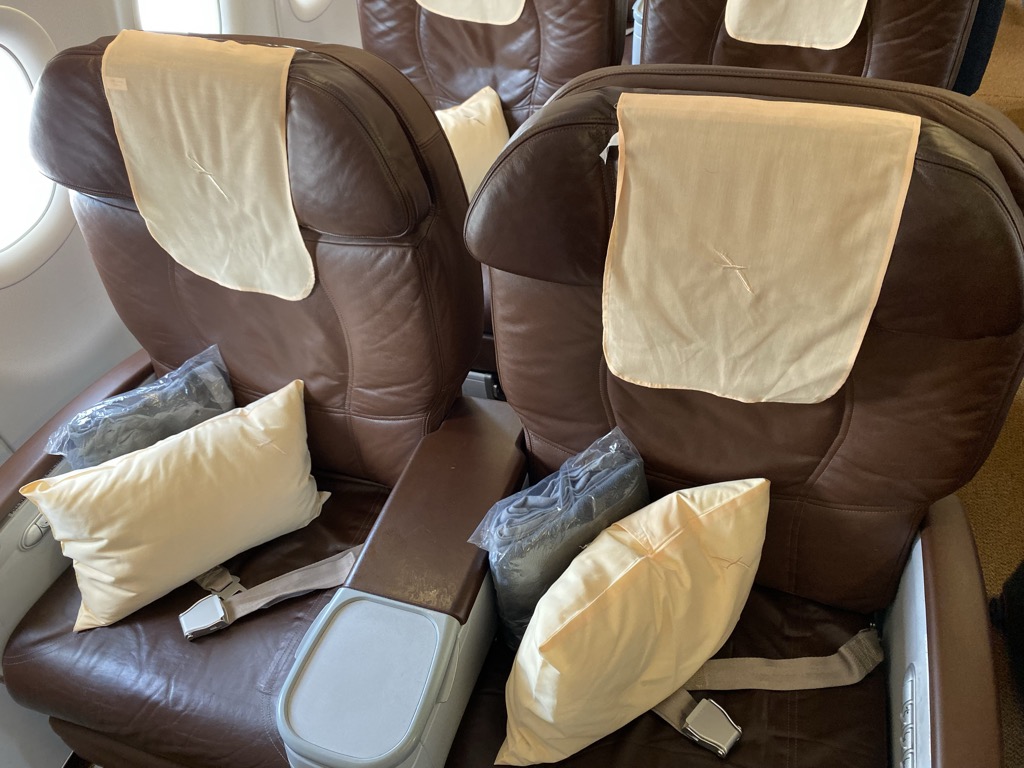 Die Sitze oder besser Sessel sind für den kurzen Flug mehr als komfortabel. Mit einer europäischen Business Class, bei der nur der Mittelsitz frei bleibt, ist es nicht zu vergleichen. Jeder Sitz ist mit braunem Leder bezogen uns bietet reichlich Platz. Mit meinen 1,74m Größe hatte ich noch verhältnismäßig viel Platz zum Vordersitz.