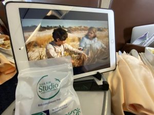 Auf jedem Sitz lagen bereits eine Decke plus Kissen bereit, in der Tasche am Vordersitz steckten zudem iPads, auf denen man sich durch das IFE „wischen“ konnte. Um das iPad richtig nutzen zu können, wurden Einmalkopfhörer ausgeteilt – typische in ears mit verschieden großen Silikonaufsätzen. Auch iPad-Halter wurden verteilt, sodass man das iPad nicht in der Hand halten musste. Eine wirklich tolle Alternative auf Kurzstreckenflügen!