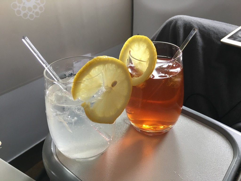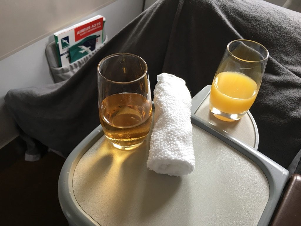Etwa 15 Minuten nach dem Start wurden vom Piloten die Anschnallzeichen ausgeschaltet und die Crew begann mit Ihrem Service. Wir hatten auf diesem Flug übrigens sechs Flugbegleiter an Bord, von denen sich zwei ausschließlich um die Business Class kümmerten. Allerdings muss man hier sagen, dass zwei der sechs Flugbegleiter „Trainees“ waren, also noch in der Ausbildung. Dennoch sind auch vier Flugbegleiter auf einem Airbus A319 eine recht große Crew.