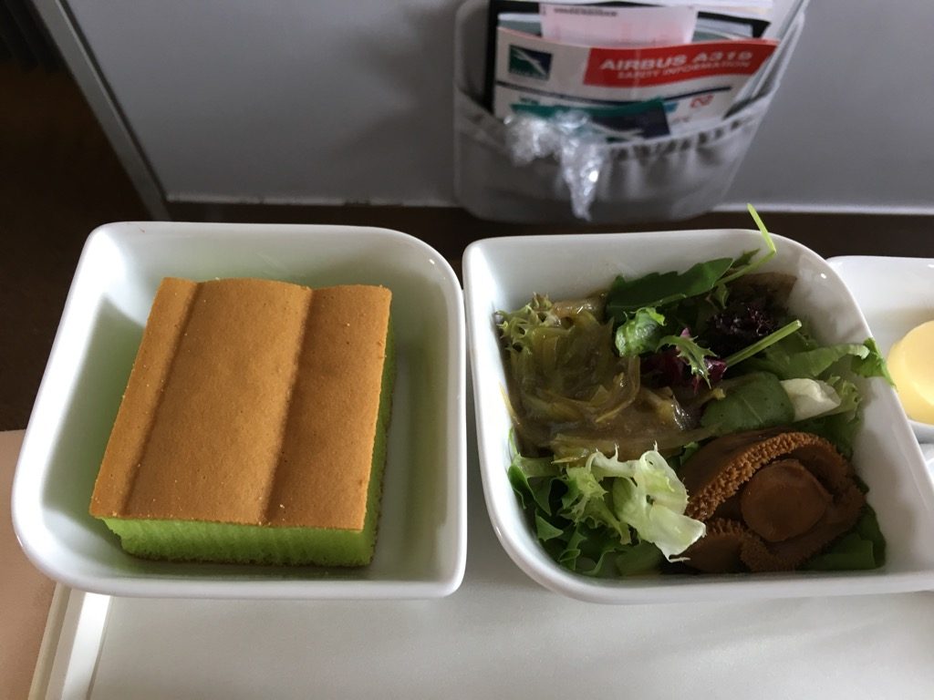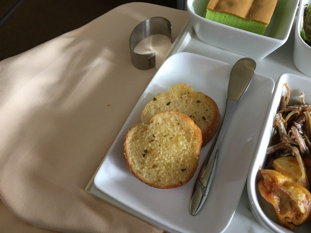 Das Essen wurde einzeln auf Tablets aus der Galley serviert. Dabei wurden sofort Vorspeise, Hauptgang und Dessert serviert. Nachdem immer ein Sitzpaar bedient wurde, wurde auch ein Brotkorb gereicht, welcher mit dem von Singapore Airlines identisch war.