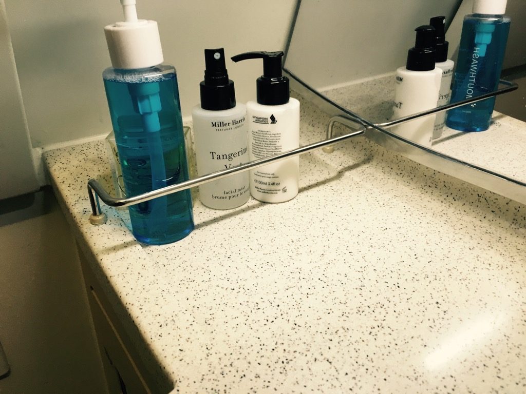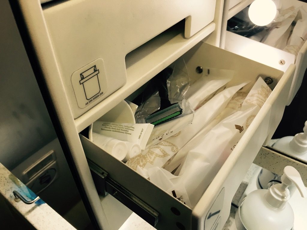 Zwischen der Business Class und der Economy Class befinden sich die zwei Waschräume der Business Class. Diese waren sehr sauber, unterschiedenen sich allerdings kaum von normalen Flugzeugtoiletten. Lediglich die umfangreichen Amenities in den Toiletten sind hier hervorzuheben. Es ist durchaus sehr angenehm, dass man hier auch auf einem 2 Stunden Flug Zahnbürsten, Rasierer und verschiedene Cremes findet. Daher lässt es sich auch verschmerzen, dass es kein Amenity Kit für Business Class Passagiere gibt.