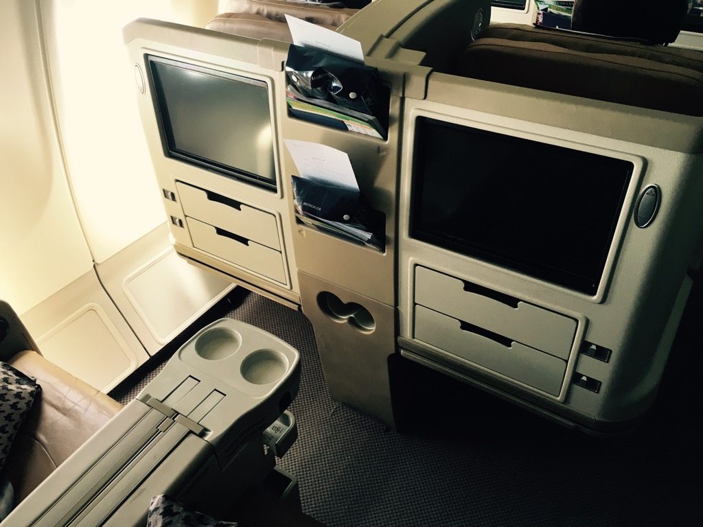 Die Sitze selbst sind mit hellbraunem Leder bezogen, was zwar sehr hochwertig wirkt, allerdings bevorzuge ich Sitze mit Stoffbezug, da diese beim langen Sitzen atmungsaktiver sind und man nicht so sehr schwitzt. Allerdings hat Singapore Airlines auch tendenziell eher eine recht kalt temperierte Kabine. Auf dem Sitz befand sich auch bereits beim Boarding ein Kissen und eine große Decke.