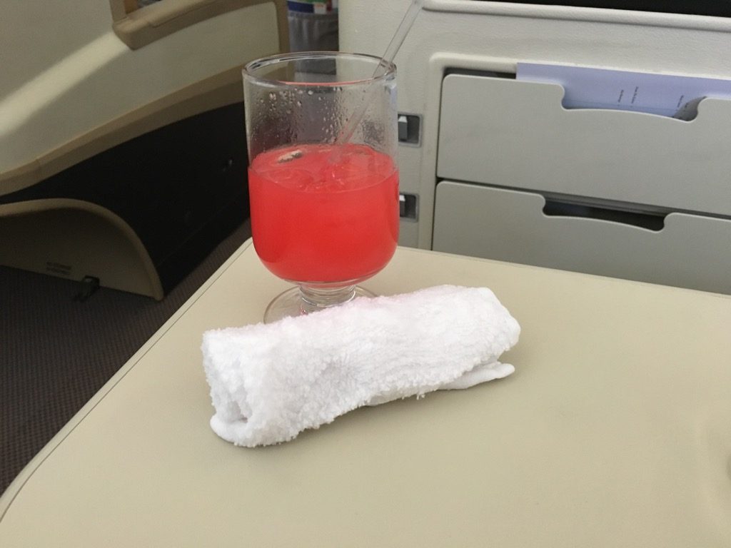 Nachdem ich den Hauptgang mehr als zur Hälfte habe zurückgehen lassen, habe ich mich für ein flüssiges Dessert in Form eines zweiten Singapore Slings entschieden. Zu diesem gab es noch ein heißes Tuch und etwas Small Talk mit dem Flugbegleiter.