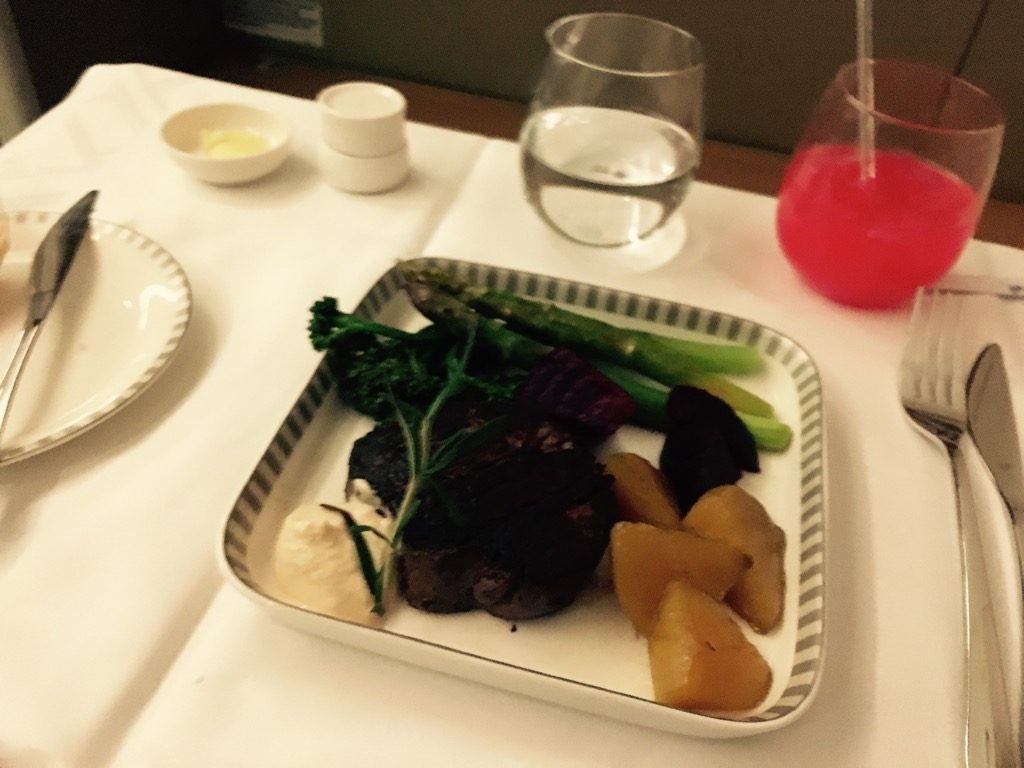 Noch vor dem Start wurden unsere Wünsche für das Abendessen abgefragt. Ich hatte eigentlich einen Hauptgang über die Book the Cook Option bei Singapore Airlines bestellt. Leider wurde diese nicht geladen. Daher habe ich das Rinderfilet aus der Karte bestellt. Die Flugbegleiterin hat sich mehrfach für diesen Fehler entschuldigt. Was hier schief gelaufen ist, kann ich nicht sagen, allerdings war es sicherlich nicht die Schuld der Dame.