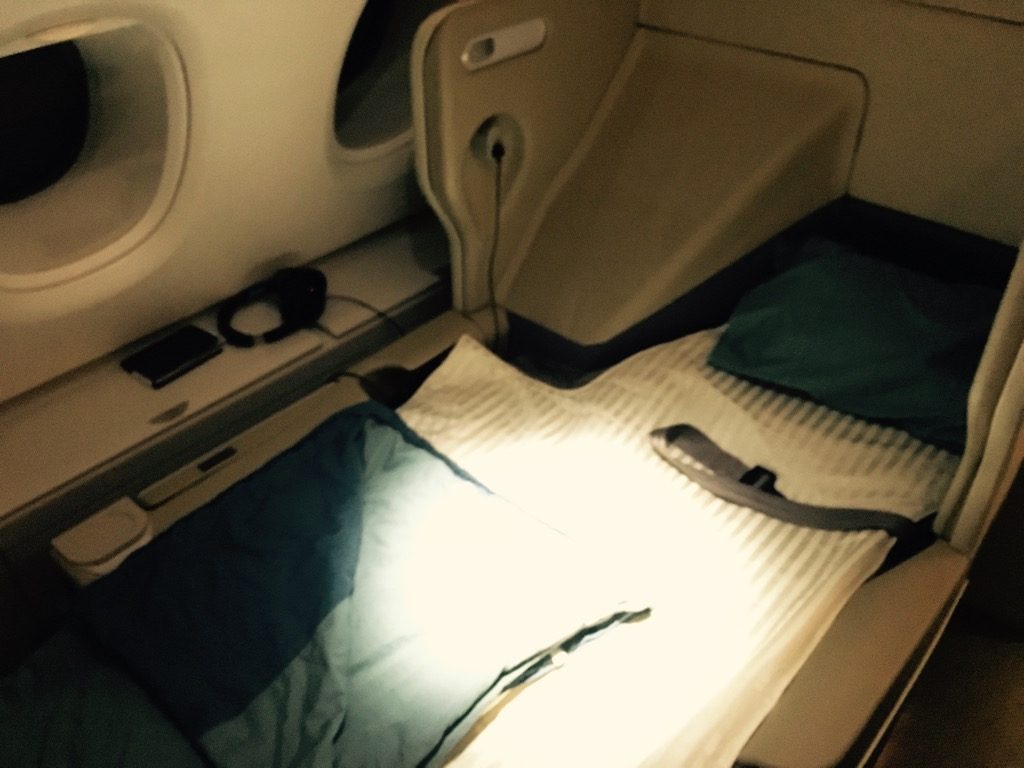 Das Bett in der Singpore Airlines Business Class ist extrem breit, zumindest in der Mitte des Bettes. Allerdings muss man zum Schlafen schräg liegen, da der der Sitz im Kopfbereich und grundsätzlich auch im Fußbereich deutlich enger zuläuft.