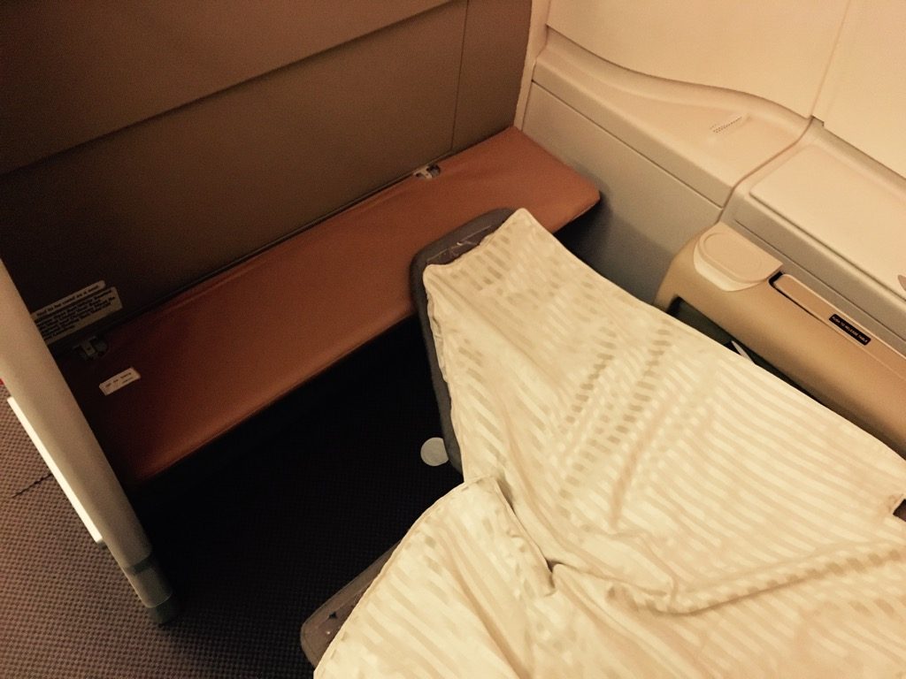 Der Singapore Airlines Business Class Sitz lässt sich natürlich auch in ein komplett flaches Bett verstellen. Hierfür muss man allerdings aufstehen und die Rückenlehne umklappen. Dies ist nicht weiter kompliziert und wird in der Business Class zu Beginn des Fluges in einem Video erklärt. Die Crew hilft hierbei allerdings auch gerne.