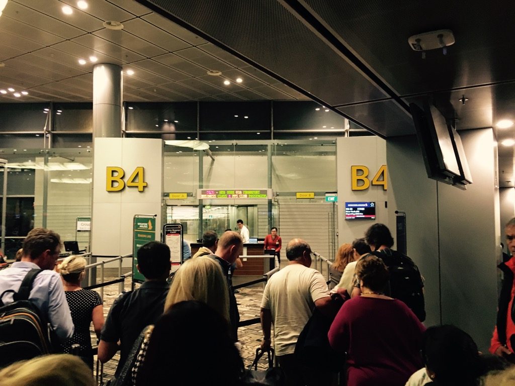 In Singapur gibt es keine zentrale Sicherheitskontrolle. Daher befinden sich direkt vor dem Gate Kontrollstationen für die Passagiere. In unseren Fall gab es drei Kontrollstellen, an welchen alle Passagiere für Frankfurt, Düsseldorf und Paris kontrolliert wurden. Eine eigene Schlange für First- und Business Class Passagier gab es leider nicht, sodass wir hier einige Minuten anstehen mussten.
