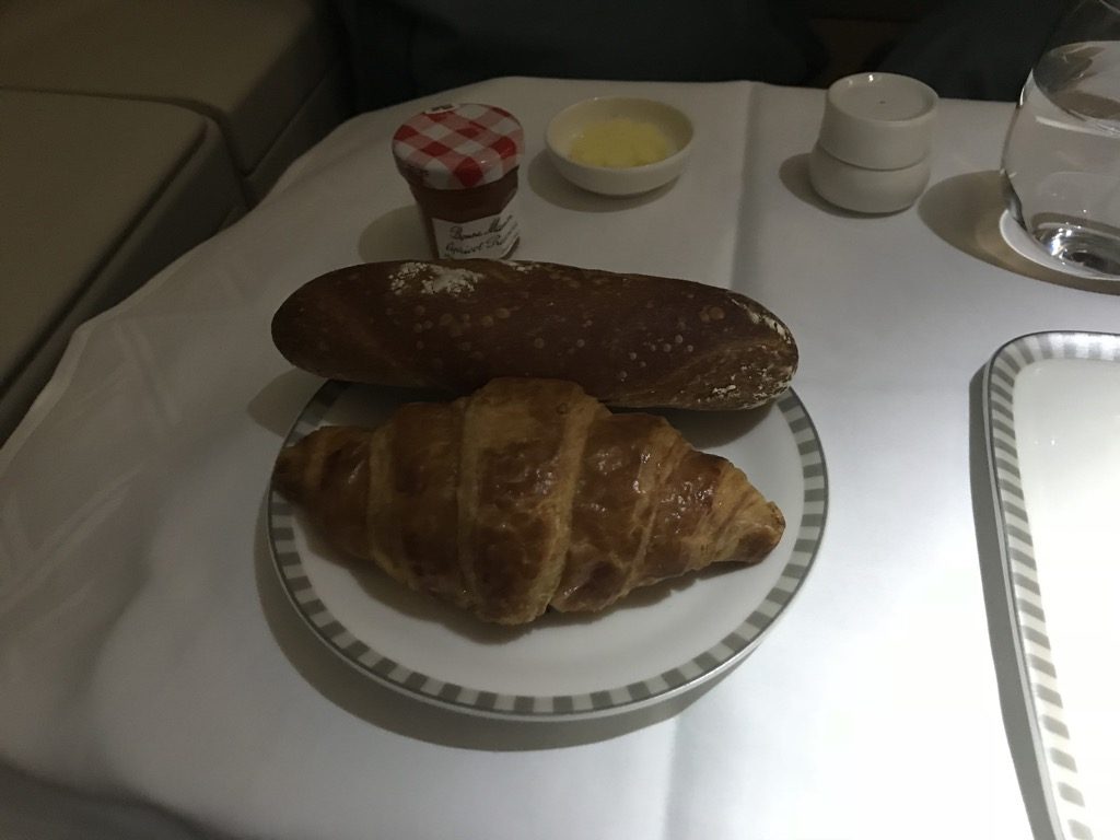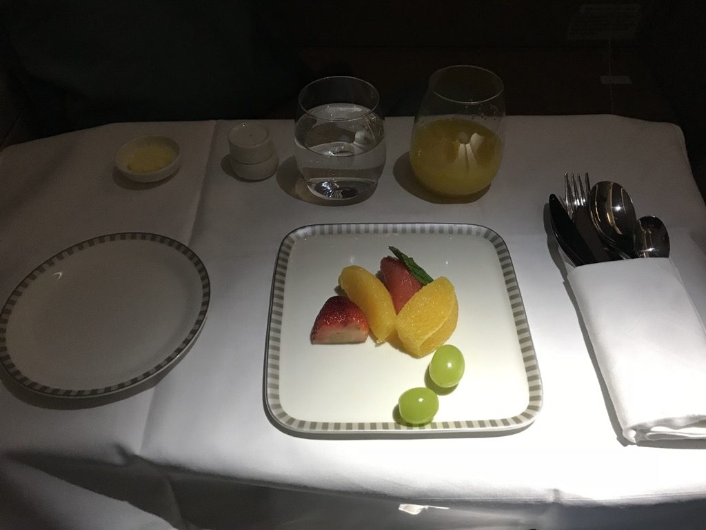 Als Vorspeise gab es frische Früchte, sowie eine Auswahl aus dem Brotkorb. Interessanterweise wurde jedem Passagier erst einmal Wasser, Orangensaft und Kaffee hingestellt. Wenn man etwas anderes wollte, musste man dies aktiv bestellen.