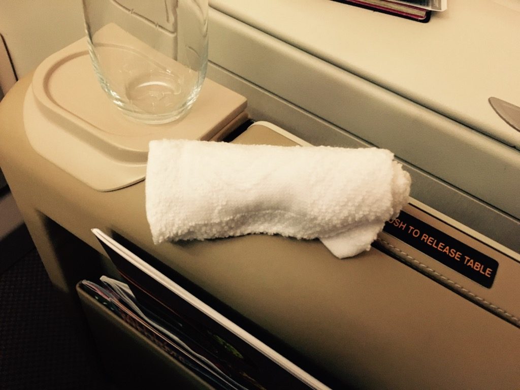 Nachdem wir auf unserem Platz angekommen sind, wurden wir sehr freundlich begrüßt und uns wurde ein Willkomensgetränk angeboten. Zur Auswahl standen Champagner, Saft und Wasser. Auch das übliche heiße Tuch, kam nur kurz danach noch am Boden.