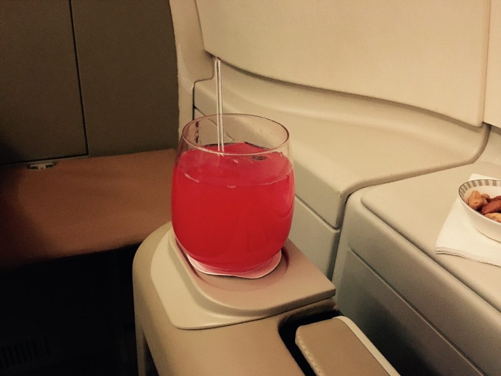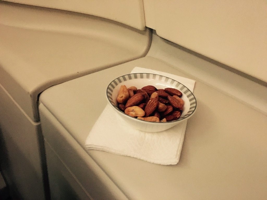 Direkt nach dem Start, wurde ein erstes Getränk serviert. Ich habe mich für meinen üblichen Singapore Sling entschieden, zu welchem es noch ein paar Nüsse gab.